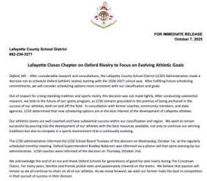 “After considerable research and consultations, the Lafayette County School District Administration made a decision not to schedule Oxford (athletic teams) starting with the 2026-2027 school year,” a statement from the Lafayette County School District reads. “After fulfilling future scheduling commitments, we will consider scheduling options more consistent with our classification and goals.