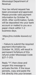 “These texts are NOT from the Mississippi Department of Revenue and are NOT LEGITIMATE,” a statement from the department reads. “The department will not send requests for payment or request personal information via text message.”