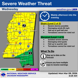 The northern tip of the state, from Southaven east to Corinth, along with much of the Pine Belt west toward Natchez, is under a Marginal Risk (Level 1 of 5). Conditions could include storms, hail up to a quarter size, heavy winds, and possibly a tornado.